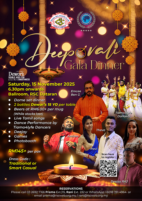 Deepavali Gala Dinner Date : 15 Nov 2025Time : 06:30pmVenue : Ballroom, RSC Dataran Please click HERE to registerBack to Events