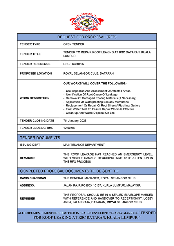 Open Tender, Repair roof leaking at RSC Dataran
